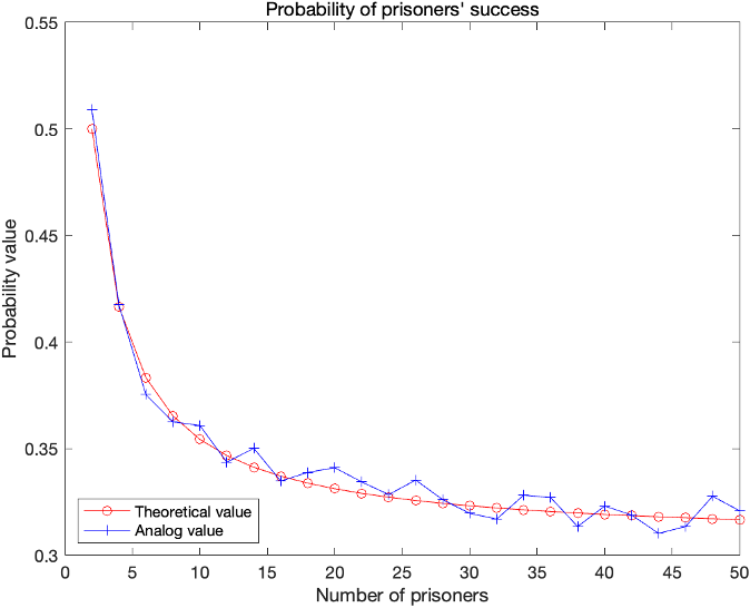 使用 MATLAB 仿真验证计算结果。当囚犯人数为 \(2-50\) 时,对于每种情况,模拟 \(10000\) 次并统计释放囚犯的频率,以获得图中的曲线。